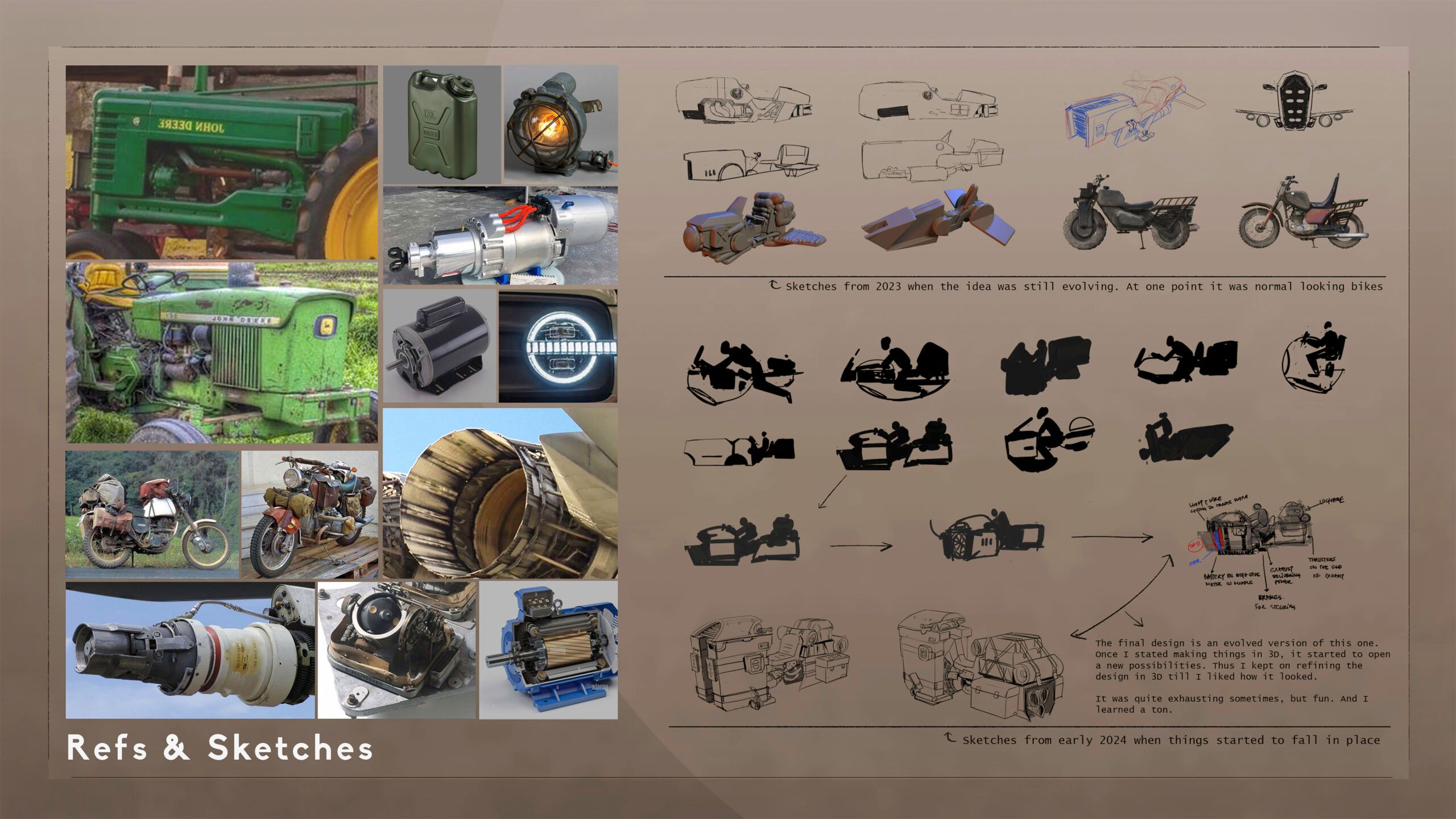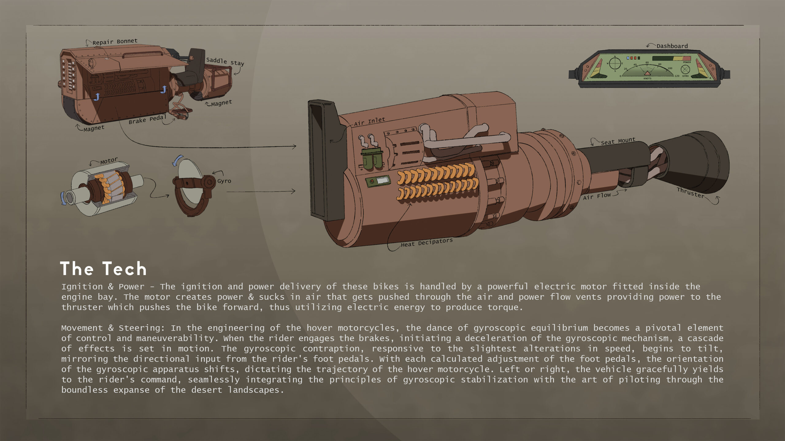 This motorcycle design is a product of that idea where I challenge myself to solve the problem of how a hover vehicle would be functional, what kind of technology would be existing and how those technologies would be executed to make this hover vehicle function.