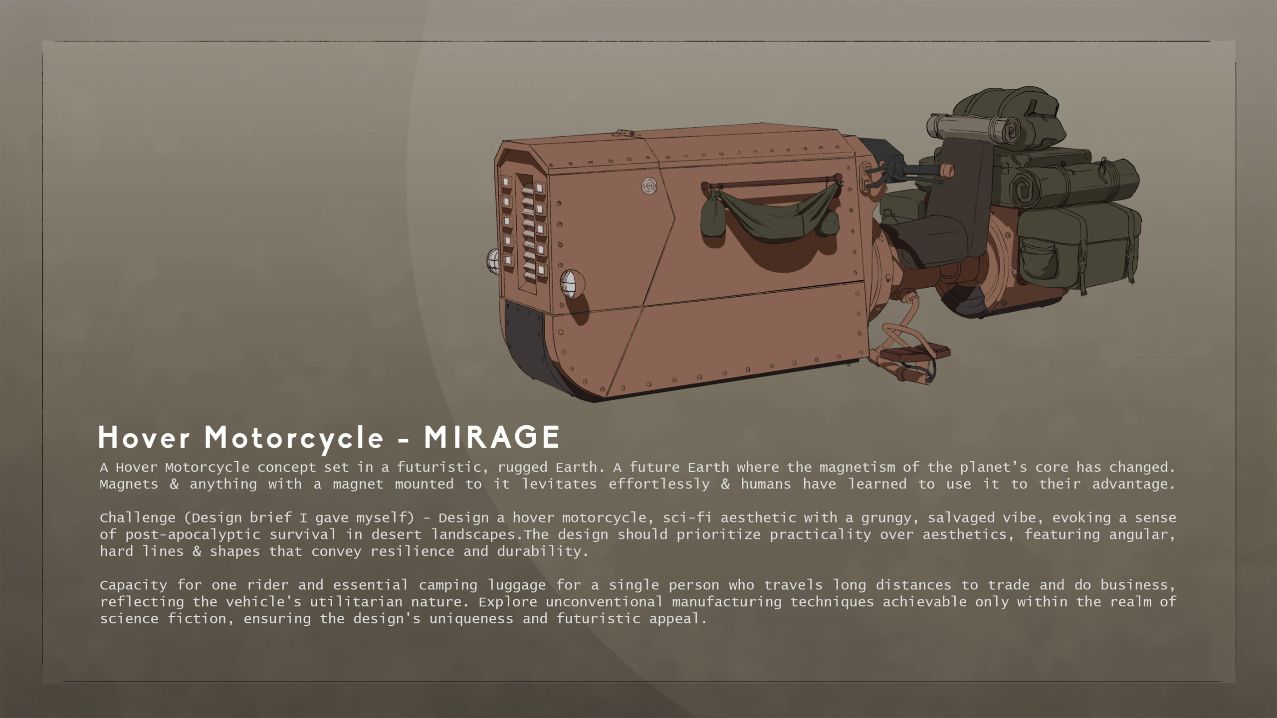 Mirage – A hover motorcycle personal project. I worked on for quite a while, more than I generally do but it was worth while. The reason to take on this arose out of necessity to challenge myself to do something that is out of my comfort zone and take a break from doing a one off painting. A little about the world this hover bike lives in – it is set in a futuristic, rugged Earth, where the magnetism of the planet’s core has changed. Magnets & anything with a magnet mounted to it levitates effortlessly & humans have learned to use it to their advantage.